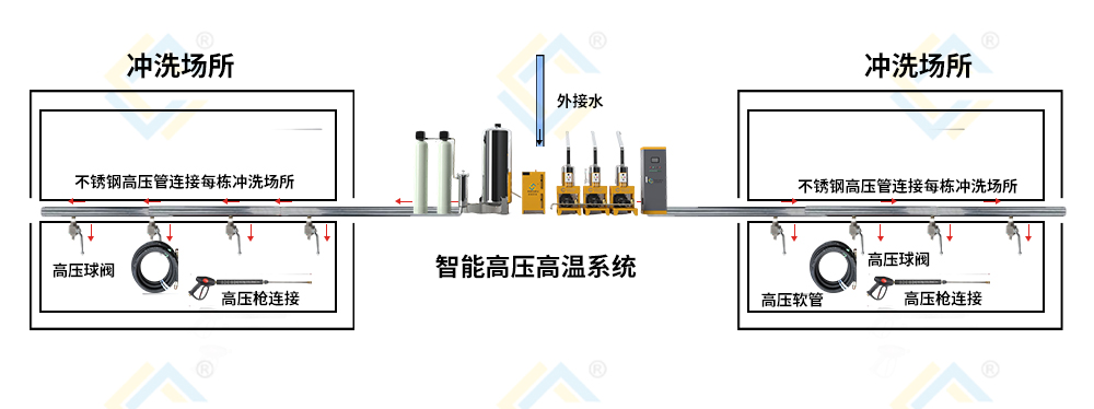 通過場所平面圖,選中合適位置布局智能高壓高溫主機,外接水通過主機,向各個場所供應高壓高溫水,并且可以實現(xiàn)物聯(lián)網(wǎng)控制主機啟動,員工只需攜帶高壓軟管和高壓水槍就可以作業(yè),各個場所可以同時作業(yè),提高工作效率,無觸電風險!